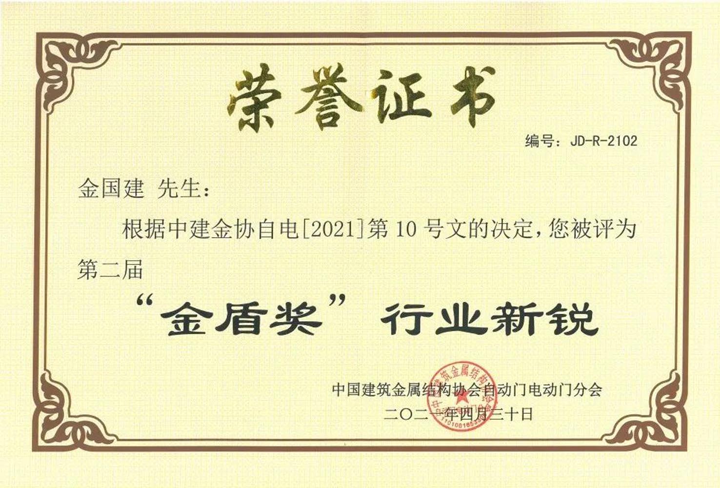 “金盾獎‘行業(yè)新銳’”榮譽證書
